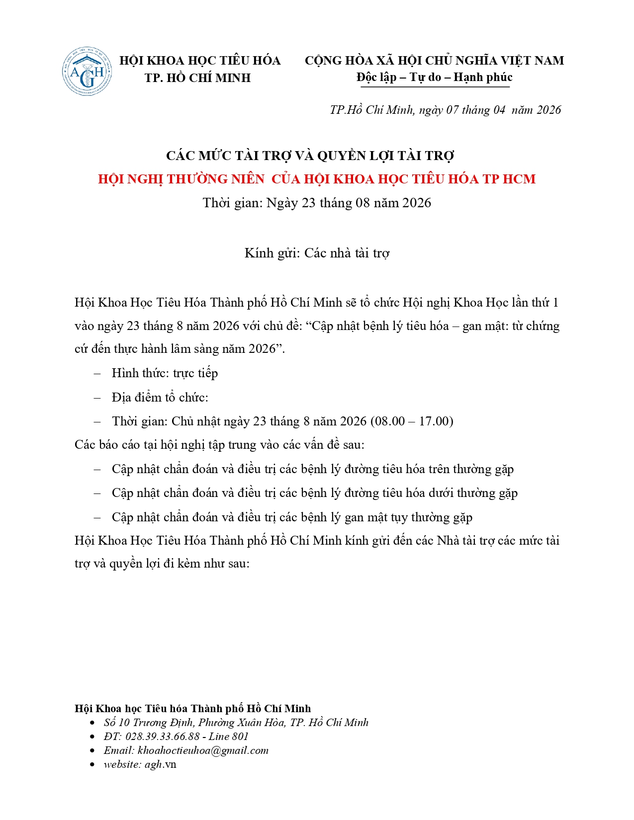 Thông báo V/v Tài trợ Hội nghị thường niên của Hội Khoa Học Tiêu Hóa Thành phố Hồ Chí Minh