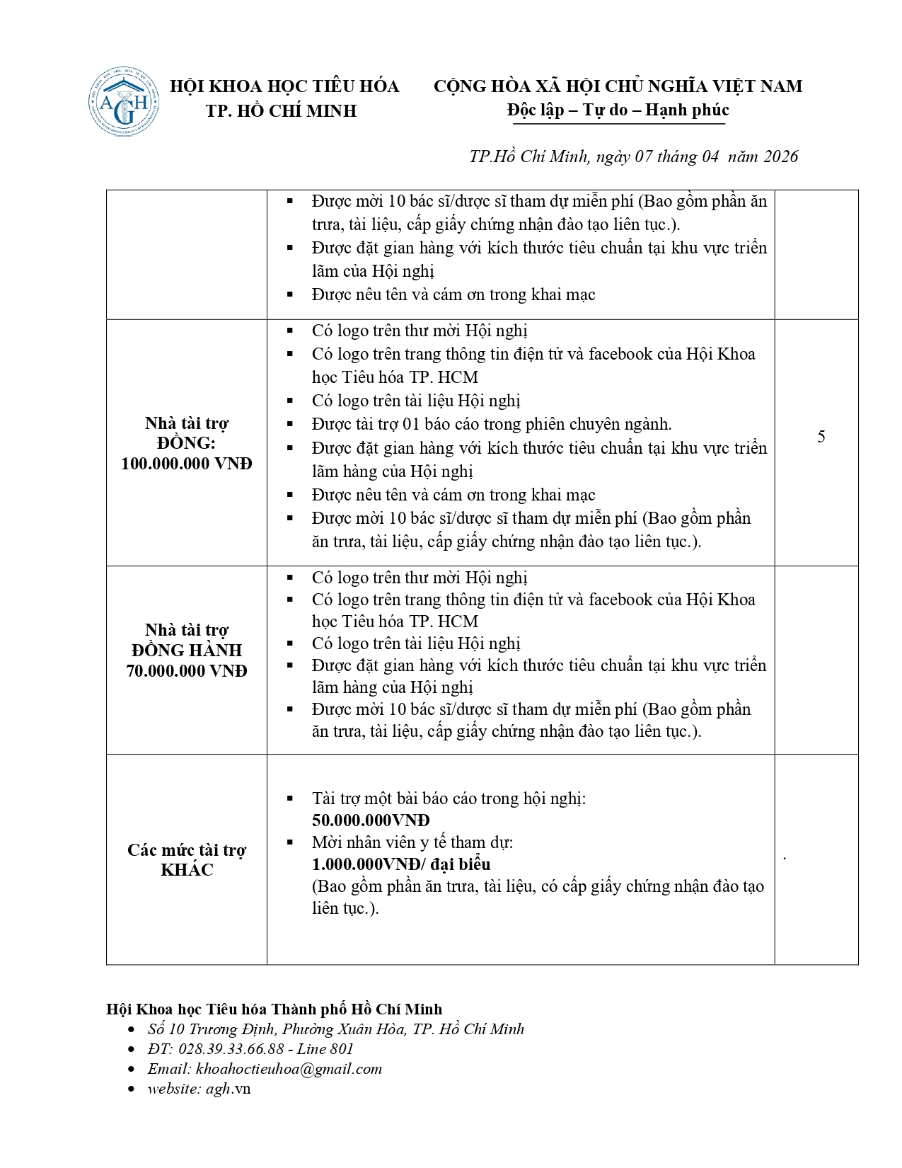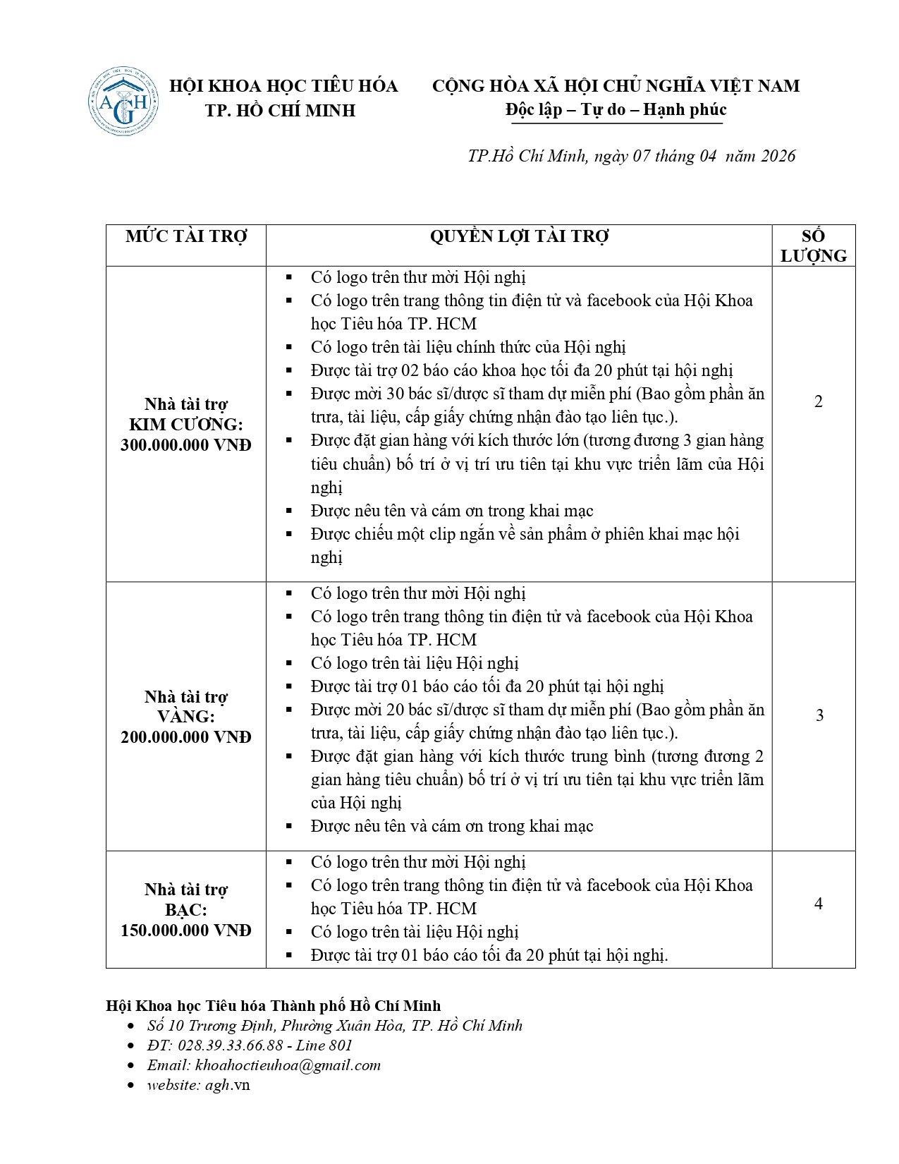 Hội Khoa Học Tiêu Hóa Thành phố Hồ Chí Minh kính gửi đến các Nhà tài trợ các mức tài trợ và quyền lợi đi kèm cho Hội nghị Khoa Học lần thứ 1 vào ngày 23 tháng 8 năm 2026 với chủ đề: “Cập nhật bệnh lý tiêu hóa – gan mật: từ chứng cứ đến thực hành lâm sàng năm 2026”.